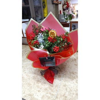 Kırmızı meyveleri ve yeşil yapraklarıyla dikkat çeken bu zarif buket,