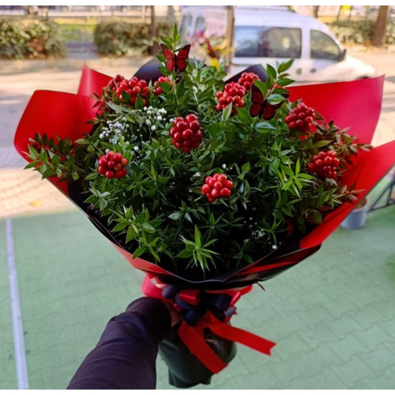Kırmızı meyveleri ve yeşil yapraklarıyla dikkat çeken bu zarif buket,